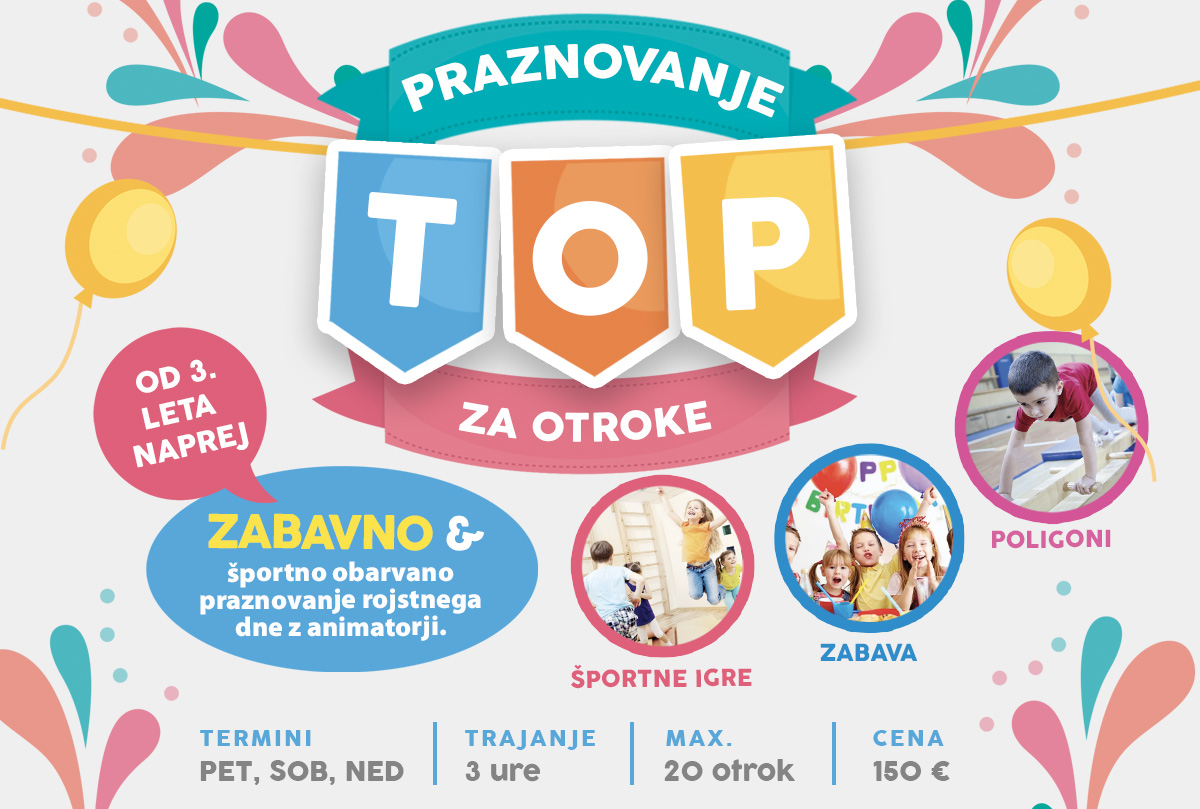 Praznovanje rojstnih dni Pozdravljeni, vas zanima, če imamo še kakšen prost termin za praznovanje rojstnega dne vašega malčka? Pošljite nam sporočilo in z veseljem vam bomo odgovorili ter našli termin za praznovanje. Izberite kategorijo sporočilaTop izkušnjaPrivat / Semi privat treningPost rehabilitacijaVodena vadbaVadba na domuVadbe za otrokeMasažaPraznovanje rojst. dni Program Vodene vadbe Individualni treningi Top izkušnja Post rehabilitacija Fizioterapija Masaže Praznovanje rojstnih dni Urnik Ekipa Kisikova komora Fizioterapija Aktualno Cenik Kontakt